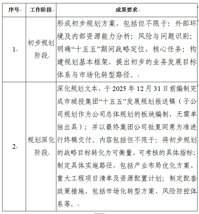 1.服務(wù)內(nèi)容:本次采購旨在選取專業(yè)規(guī)劃咨詢服務(wù)單位,通過專業(yè)機(jī)構(gòu)的深度謀劃,助力集團(tuán)公司在“十五五”期間明確發(fā)展方向,優(yōu)化資源配置,提升核心競爭力,為實(shí)現(xiàn)遠(yuǎn)期戰(zhàn)略目標(biāo)奠定堅(jiān)實(shí)基礎(chǔ)。服務(wù)內(nèi)容包括但不限于:外部環(huán)境及內(nèi)部資源能力分析、企業(yè)發(fā)展規(guī)劃目標(biāo)及業(yè)務(wù)布局、國企轉(zhuǎn)型措施、重大任務(wù)及保障措施、實(shí)施計(jì)劃、具體實(shí)施細(xì)則以及在“十五五”推進(jìn)中進(jìn)行中期和末期評估等方面。方案需在2025年9月20日前完成初稿,2025年12月31前完成報(bào)送稿,根據(jù)反饋意見在采購人要求的時(shí)間內(nèi)完成修正稿(終稿)。